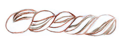 6) 兩條交互纏繞。纏繞時盡量把刀口朝上,露出漂亮的咖啡線條。