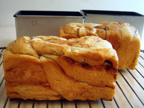 下圖是用500克麵團做的大型咖啡核桃捲,裝在12兩土司模裡烤,發酵和烤焙所需時間約與牛奶土司相同。
